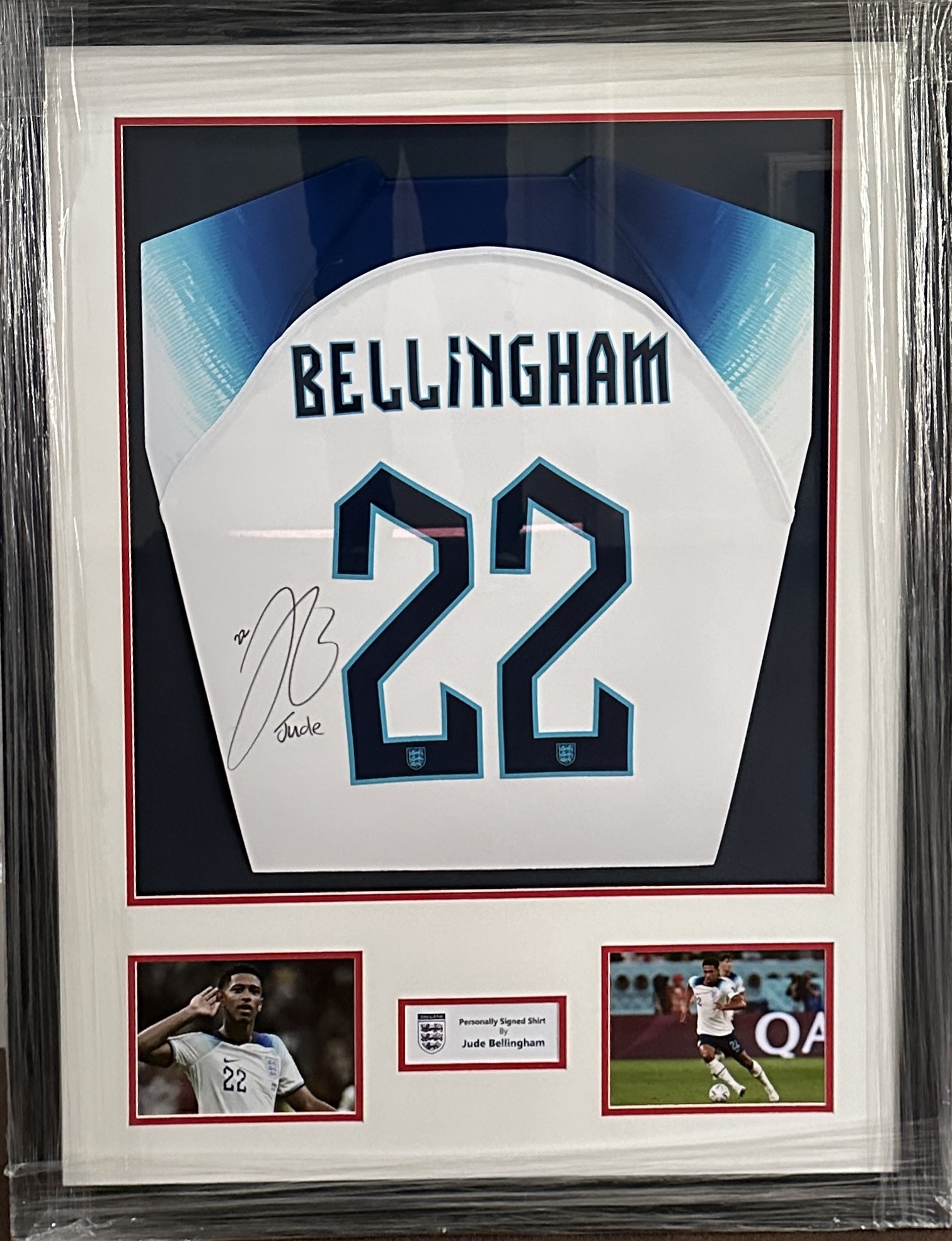 An official replica England international shirt hand signed by Jude Bellingham. The shirt has been professionally framed and has a certificate of authenticity. The shirt will be delivered free in the Uk. If worldwide shipping is required please contact us.