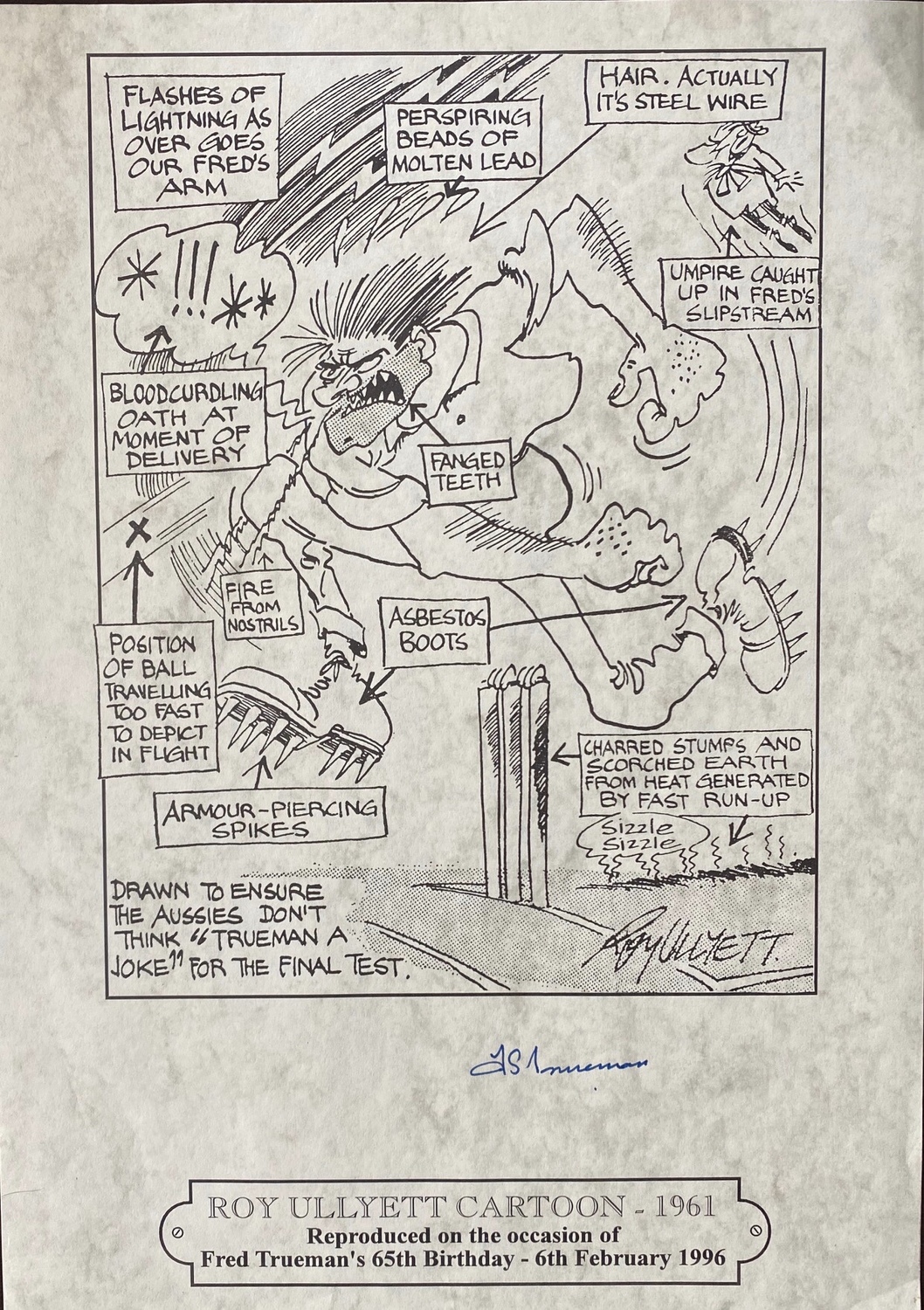 A Roy Ullyett cartoon from !961 showing a fiery Fred Trueman bowling for England. The cartoon was reproduced to celebrate Fred’s 65th Birthday in 1996.