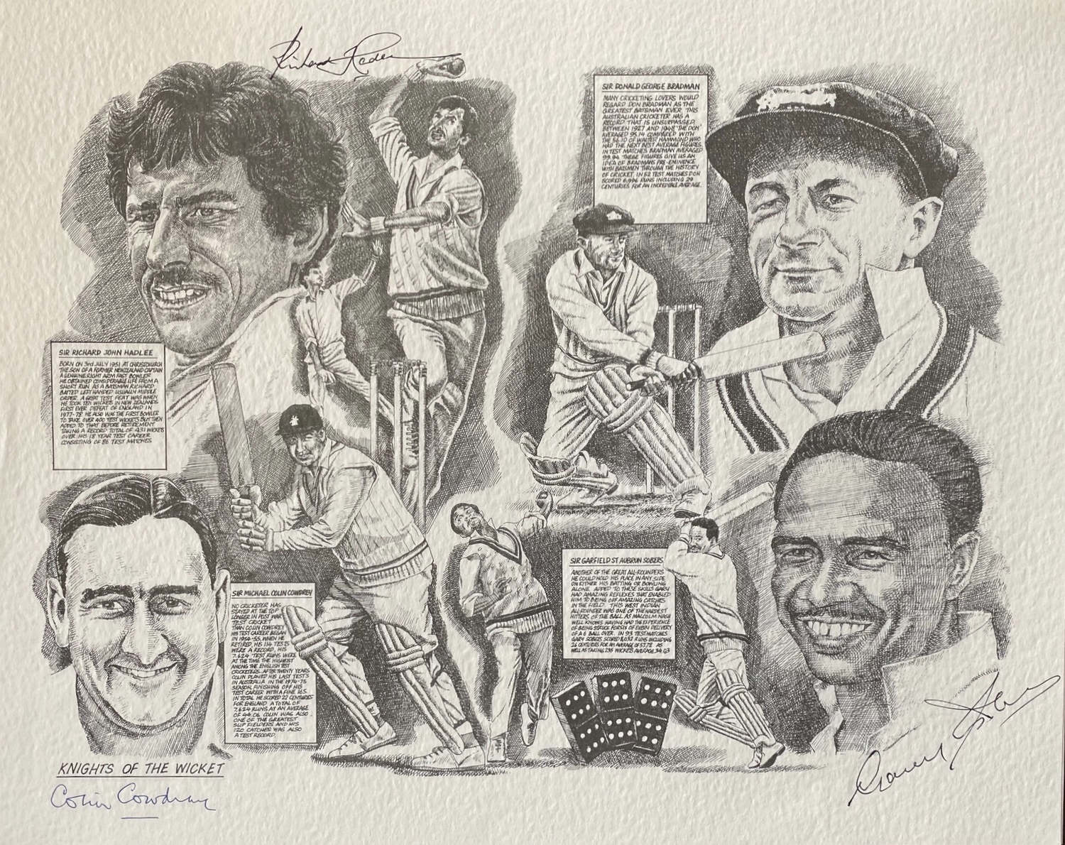 A very rare opportunity to own a print signed by three cricket legends. The Knights of Cricket print features Richard Hadlee, Colin Cowdrey, Garfield Sobers and Don Bradman. It has been hand signed by all players with the exclusion of Don Bradman. Put still at the price a great reminder of cricket legends and would be ideal for framing.