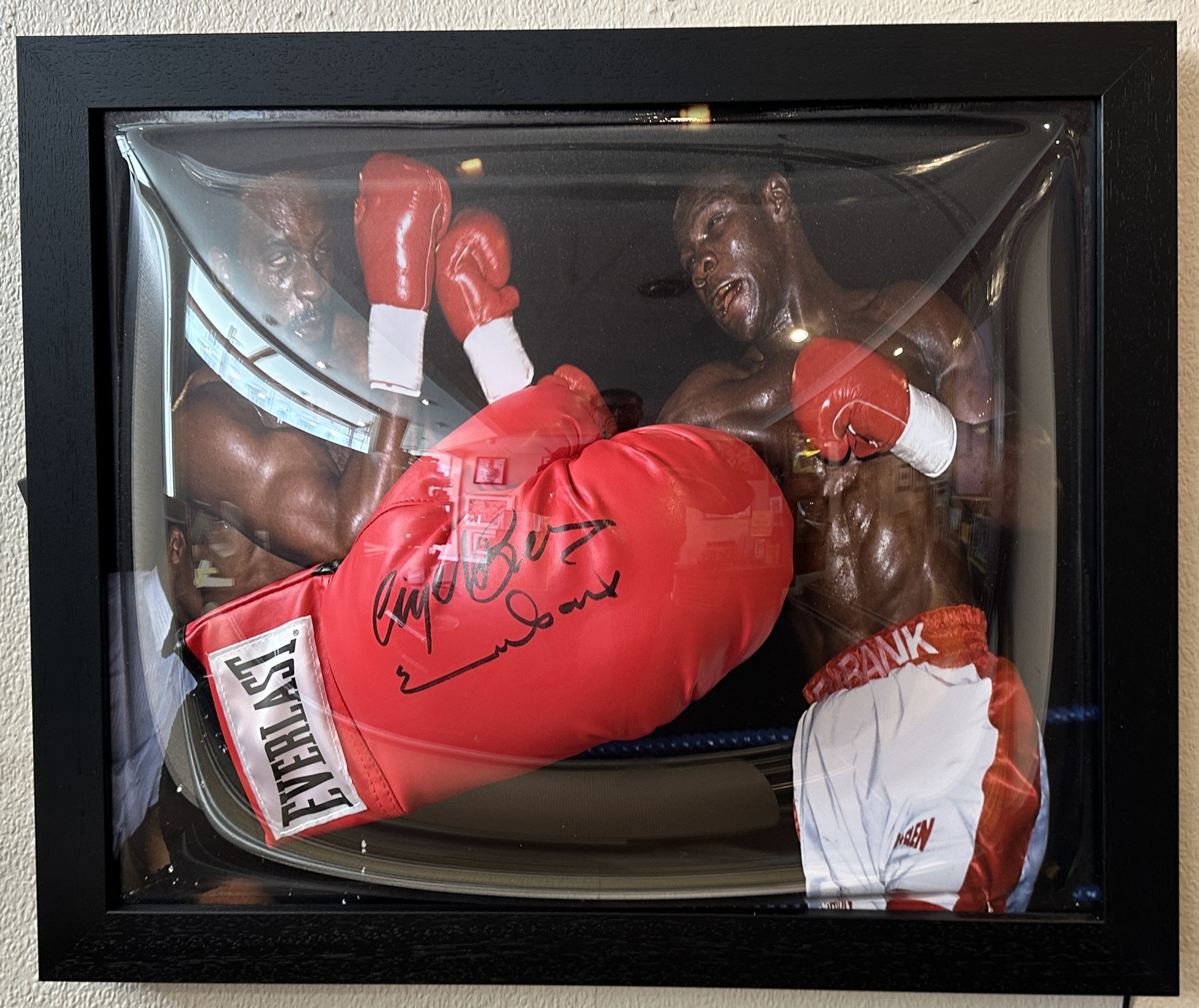 A red Everlast right handed glove signed by Chris Eubank and Nigel Benn. The two British Middleweights fought twice for the World Title. Eubank won the first in November 199 by TKO. The return fight was for the Super Middlewight title which ended as a draw.
