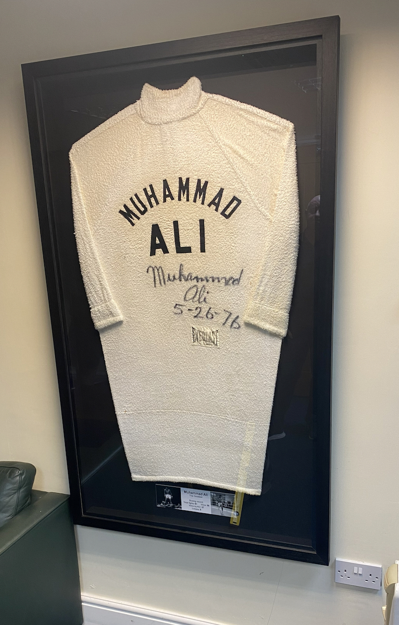 Introducing the Muhammad Ali 1976 Hand-Signed Robe - A Genuine Sporting Relic. This hand-signed robe is a true piece of history, capturing the essence of one of the most iconic athletes of the 20th century. Muhammad Ali personally signed this robe in 1976, and it's even dated by Ali himself on the 26th of May, 1976, marking a significant moment in his illustrious career.