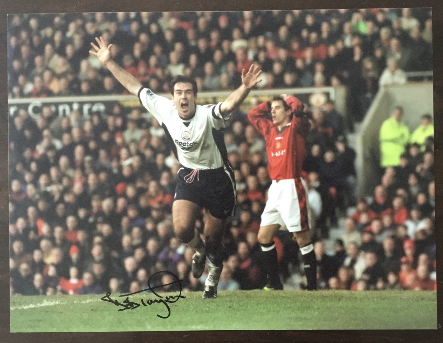 A hand signed action photo of Bob Taylor celebrating scoring a goal at Old Trafford