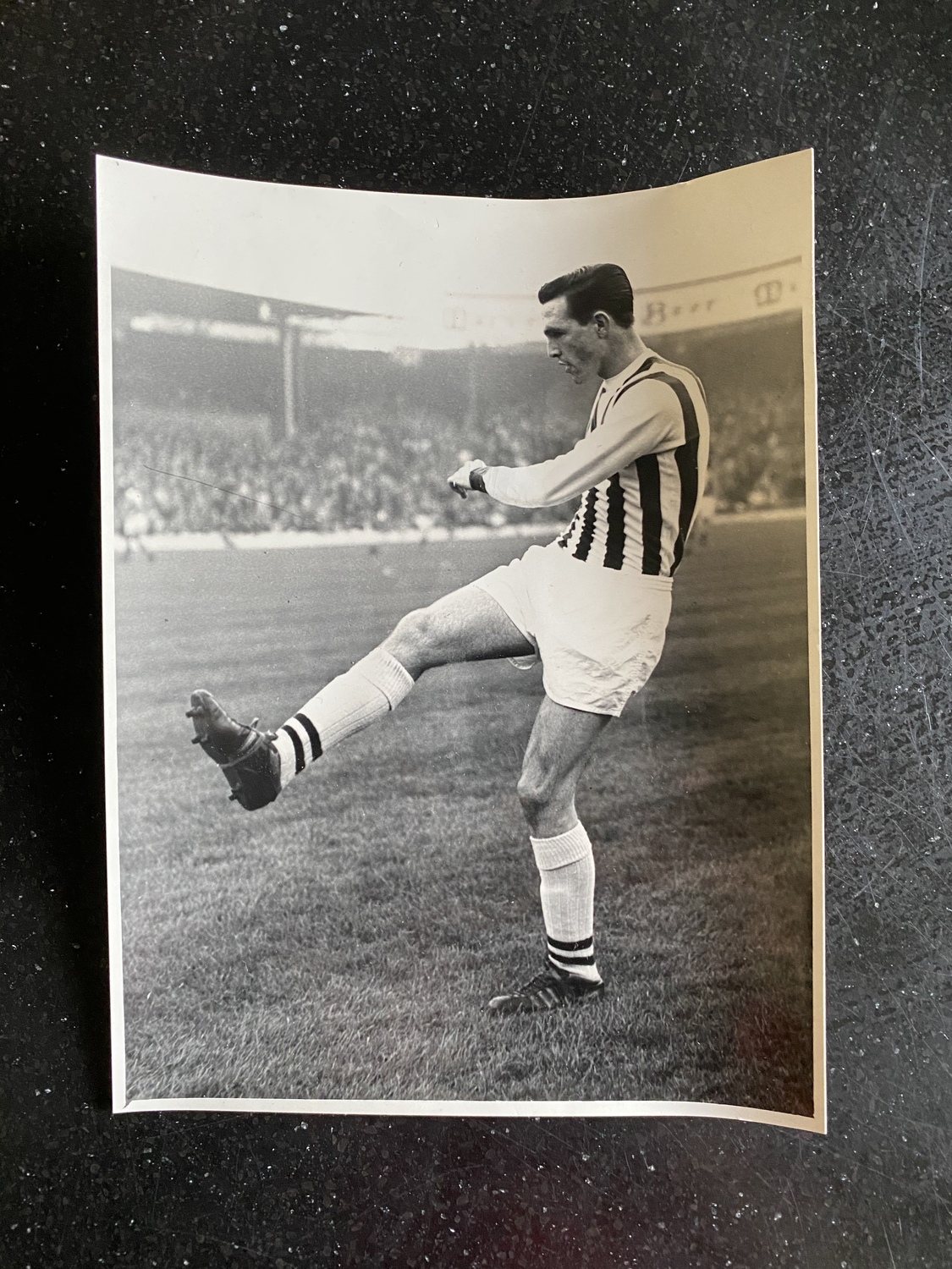 A black and white photograph of Albion legend Jeff Astle. The action pose is the work of highly collectable photographer Albert Wilkes