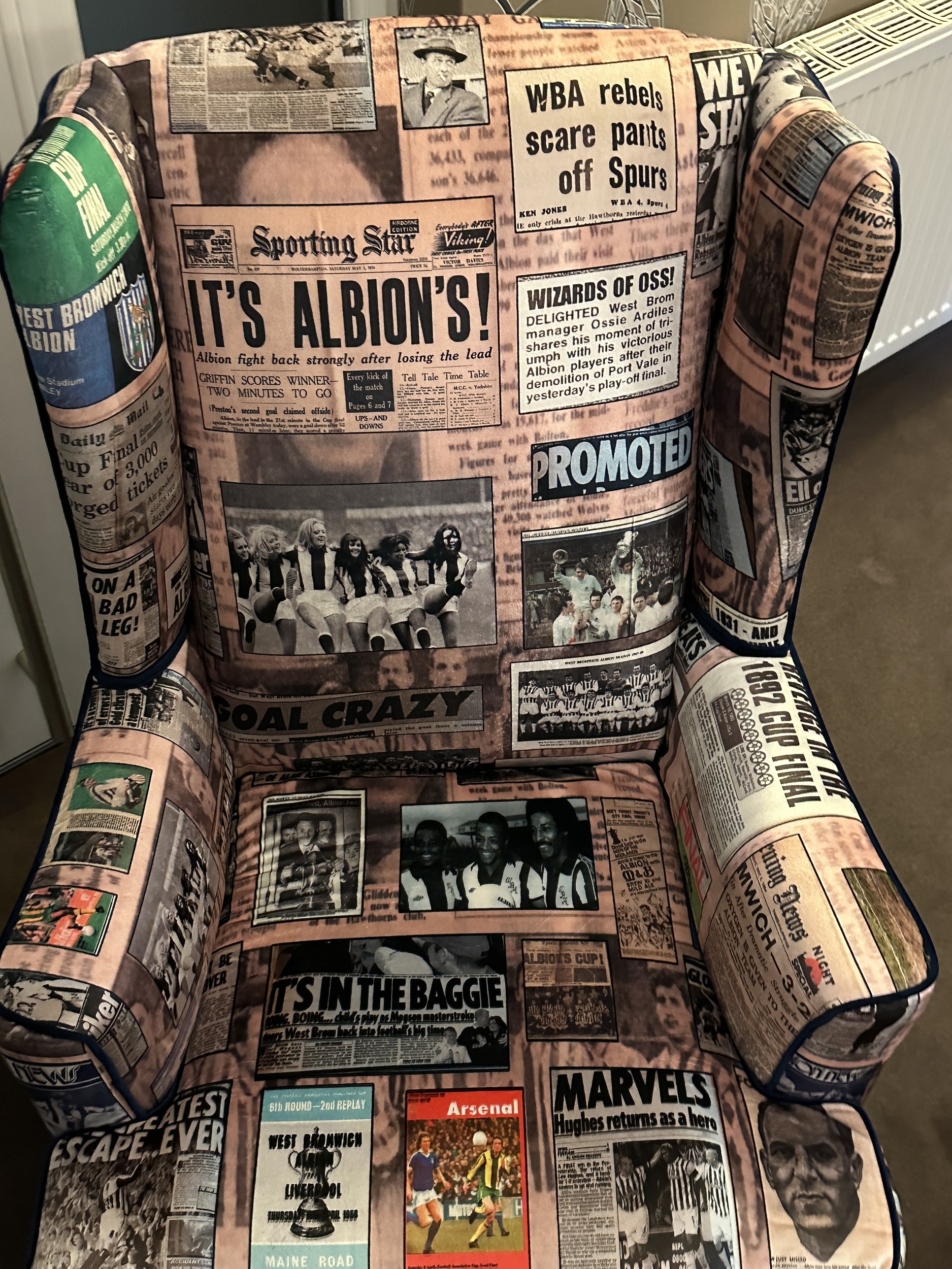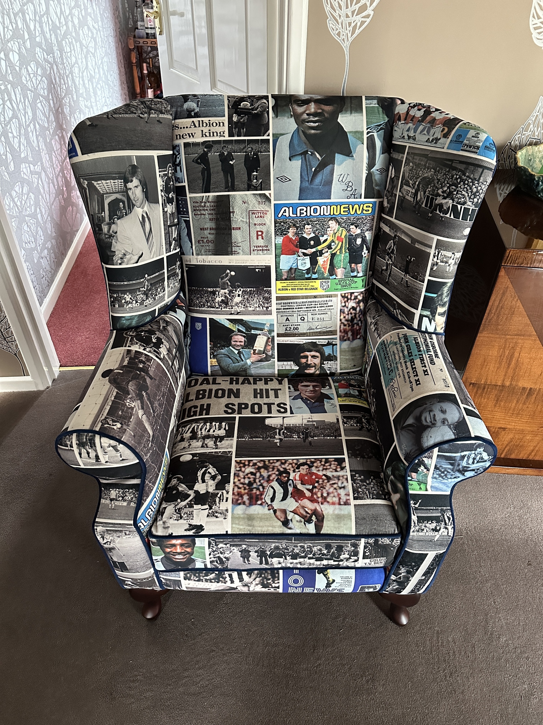 Introducing the perfect piece of furniture for any Albion fan. This bespoke armchair features a photo montage celebrating West Bromwich Albion in all its glory. This chair would make the most perfect bar chair or would look amazing in the man cave.