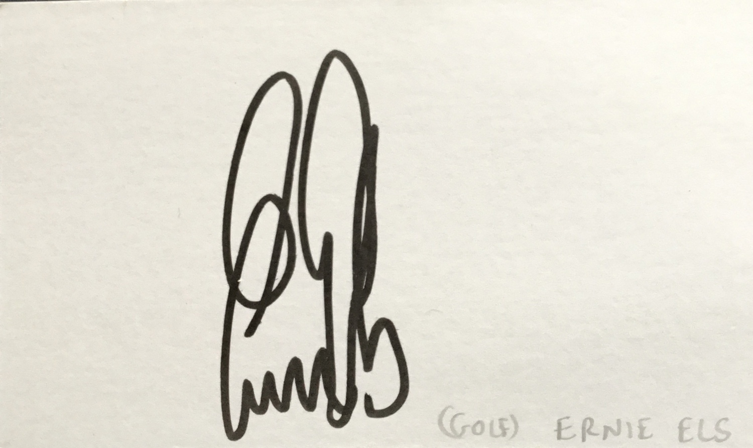 A hand signed white card signed by South African and former World number 1 golfer Ernie Els.