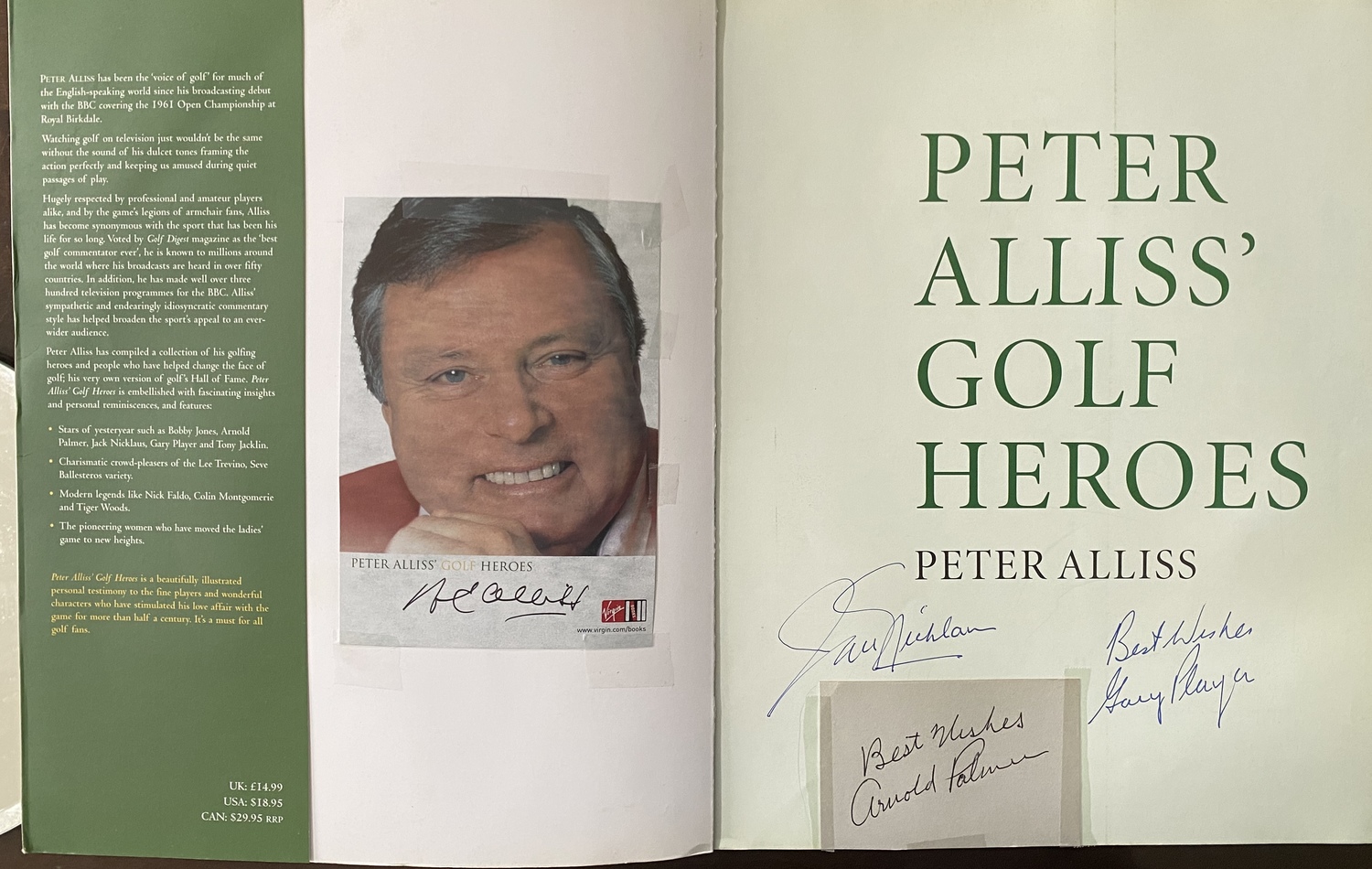 Signed by author Peter Alliss the books inside page has the added signatures of Golf Legends Jack Nicklaus , Gary Plater and added further the autograph of Arnold Palmer making the piece a valuable asset in a golf collection. ( Check out the additional photo )