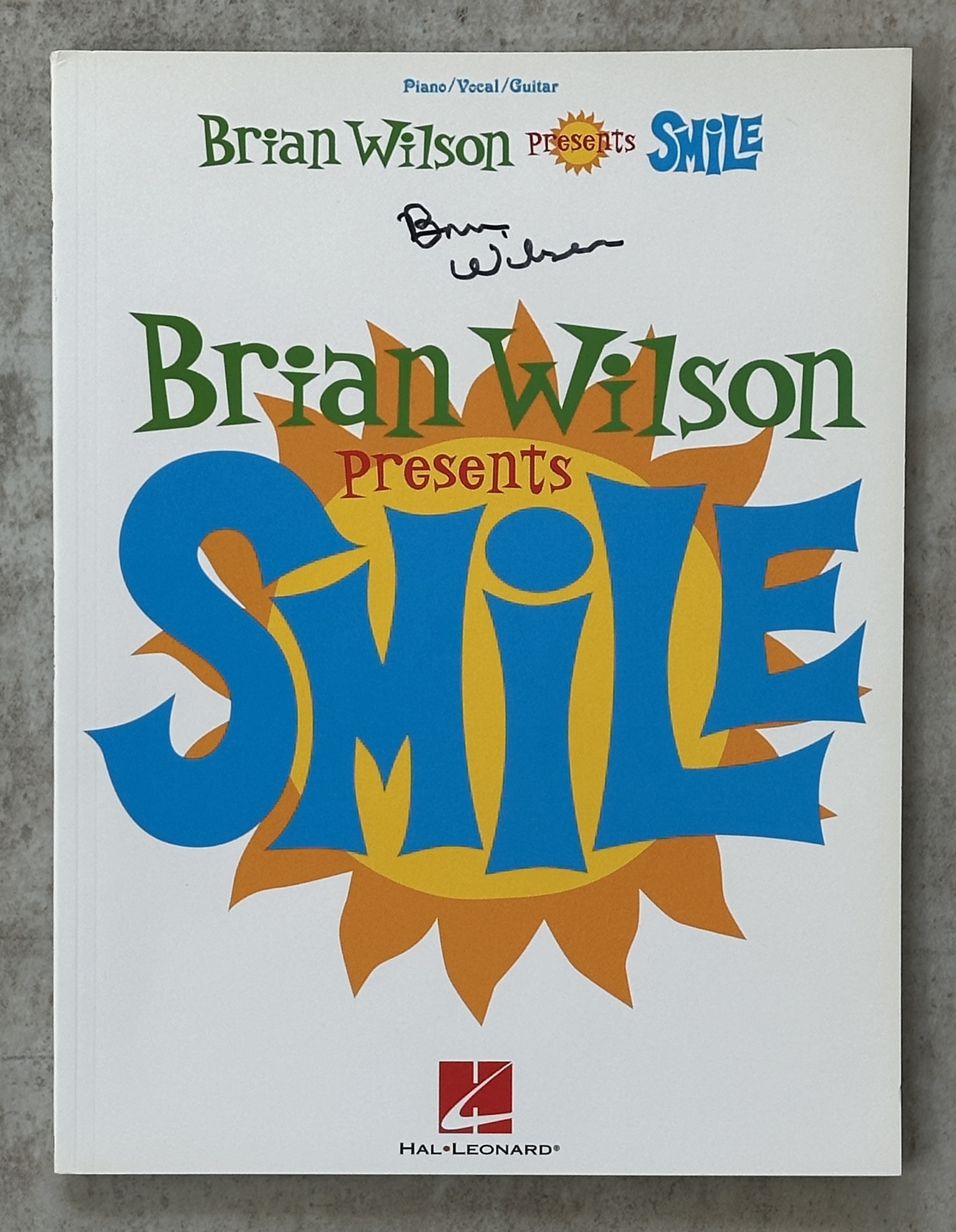 This soft cover music book was published in 2005 and has been hand signed on the cover and on the front page of every song within the book. The Smile album was started in the '60s, this album was considered the lost masterpiece of the Beach Boys until Wilson finally released it in 2004. Includes the Grammy-winning song "Mrs. O'Leary's Cow" plus: Roll Plymouth Rock Cabin Essence Surf's Up * Good Vibrations and many more.