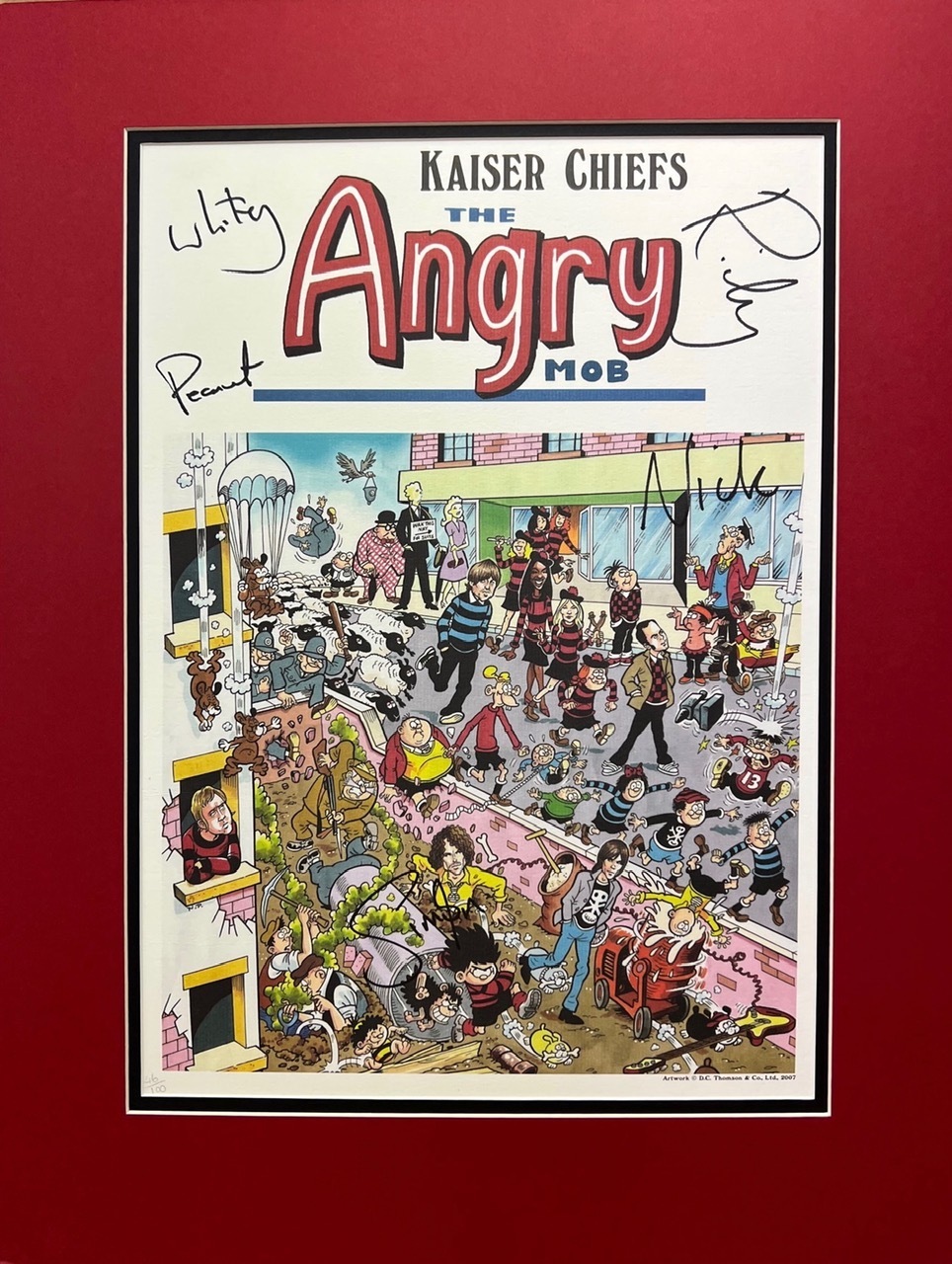 The Angry Mob poster was the title track of the Kaiser Chiefs second album. The single came with special artwork created by Beano artist Nigel Parkinson. A limited edition of the single contained an exclusive poster that could only be bought via the website. The poster is hand signed by the band.