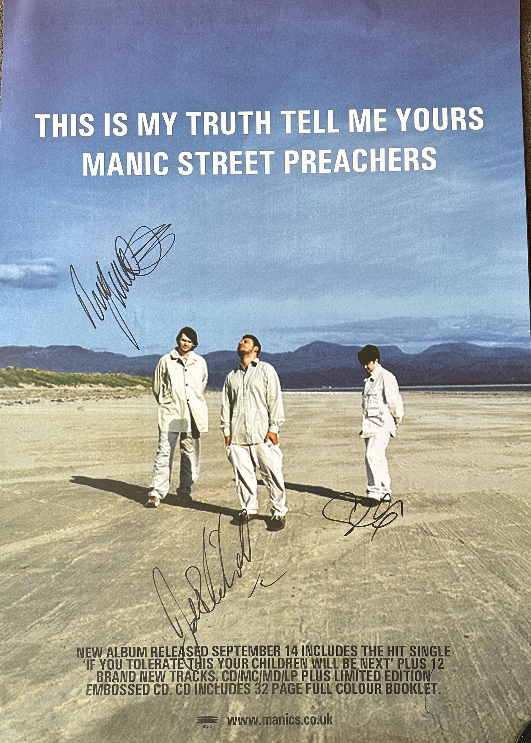 Promotional poster for the Manic Street Preachers’ acclaimed 1998 album This Is My Truth Tell Me Yours. Hand-signed by the band, this rare piece is a standout collectible for fans and collectors alike.