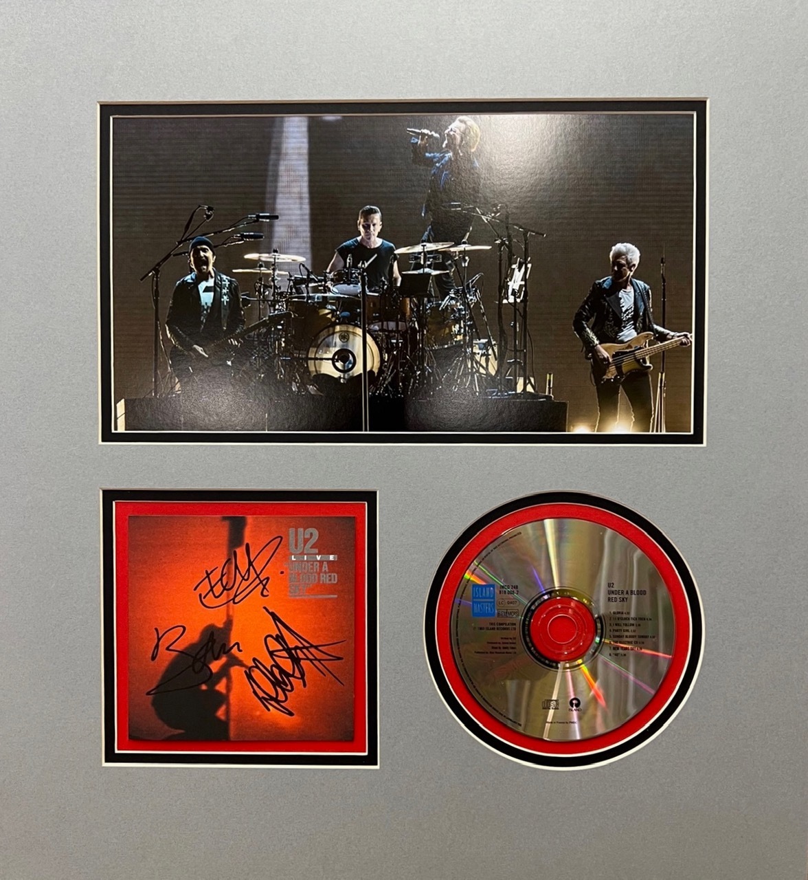 Hand signed by Bono, The Edge and Adam Clayton. Under a Blood Red Sky CD Artwork. This was a live album released in November 1983. The songs were compiled during three performances from the War Tour.