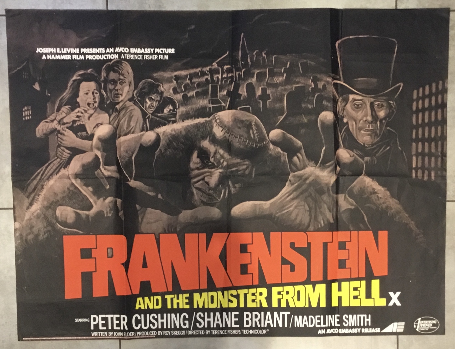 The last Frankenstein Movie by Hammer starring Peter Cushing and David Prowse. 1974 UK Quad , that has significant paper loss just below the central point on the left hand edge.