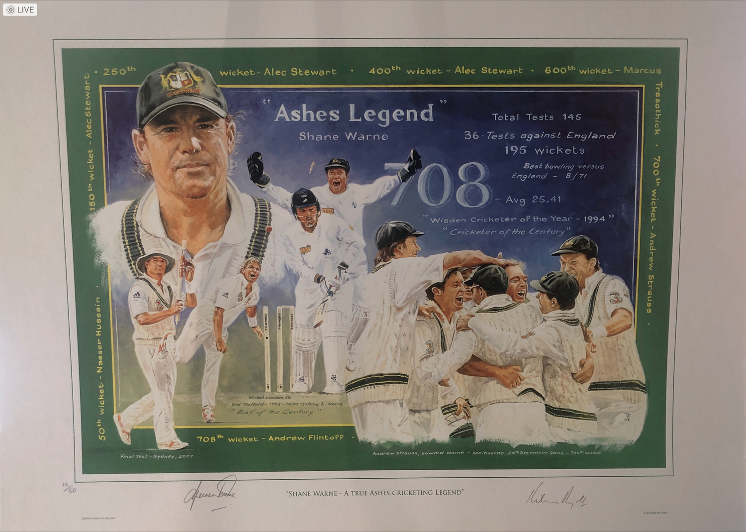 A large poster size limited edition print. Hand signed by Australian spin bowler and Ashes Legend Shane Warne.