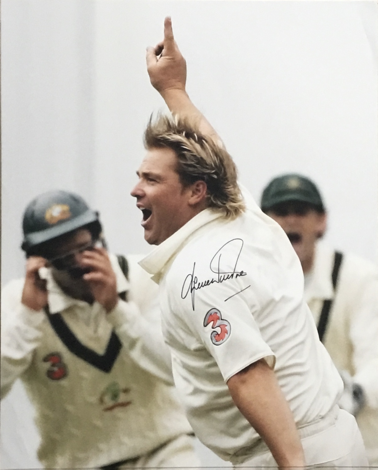 A large hand signed colour poster of Australian cricket legend Shane Warne.