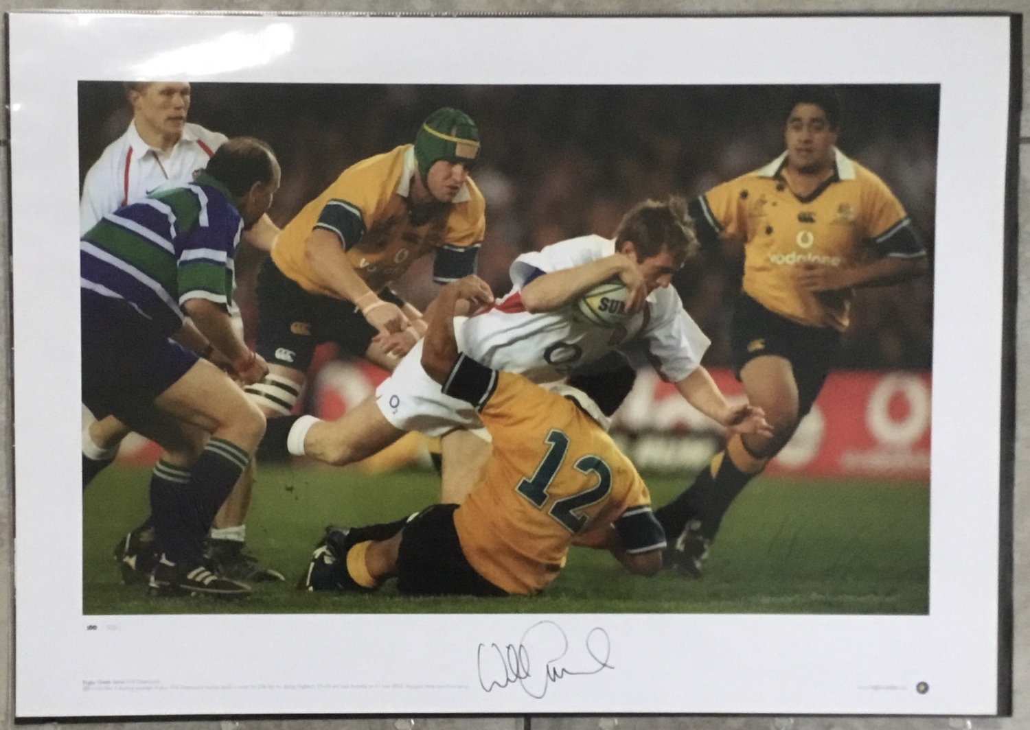 A Big Blue Tube Rugby Great Series print hand signed by England legend Will Greenwood. The print shows Greenwood scoring his 25th International try for England in a 25 14 test match victory over Australia in June 2003