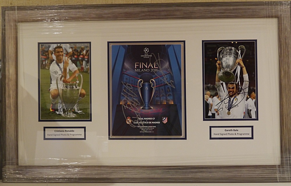 This is a fantastic opportunity to purchase a piece of UEFA Champions League memorabilia. Featured are individual hand-signed photographs of Cristiano Ronaldo and Gareth Bale, celebrating their victory in the 2016 final in Milan. Also included is the official matchday programme from that final, again hand-signed by both Ronaldo and Bale, and expertly framed by DW Creative Framing to a professional standard.